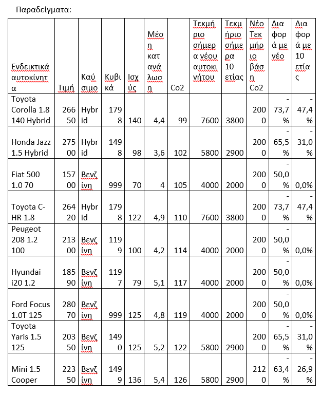 Μεταρρύθμιση: Για αυτοκίνητα που έχουν ταξινομηθεί μετά τις 1/11/2010, οι αντικειμενικές δαπάνες θα προσδιορίζονται βάση Co2 (κατ’αναλογία με τα τέλη κυκλοφορίας), με σημαντική μείωση των αντικειμενικών δαπανών, προσομοιάζοντας το ύψος των αντικειμενικών δαπανών που έχουν σήμερα τα αυτοκίνητα άνω των δέκα ετών.