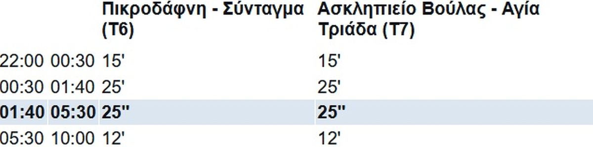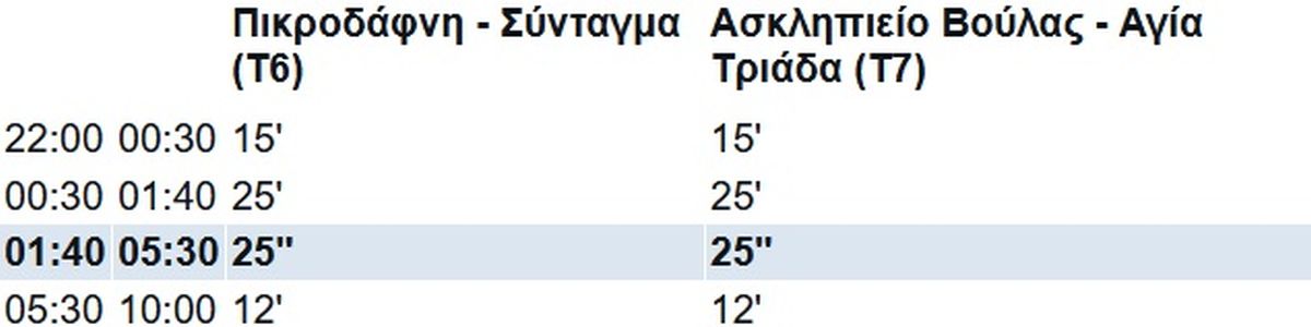 Συχνότητες διέλευσης γραμμών Τ6 και Τ7 του Τραμ από 22:00 έως 10:00
