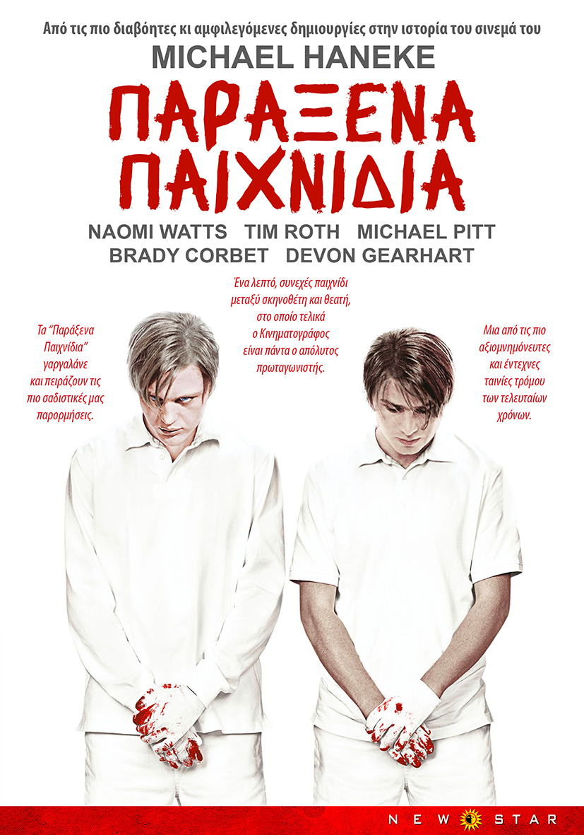 Καρέ προς καρέ αμερικάνικο ριμέικ την σημαντικής αλλά αφόρητης ταινίας του Μίχαελ Χάνεκε «Funnh games», γυρισμένο από τον ίδιο μια δεκαετία αργότερα. Δύο ευγενέστατοι νεαροί ντυμένοι στα λευκά, «τρυπώνουν» στο σπίτι μιας τετραμελούς οικογένειας και την οδηγούν στην ολοκληρωτική καταστροφή. Μια πέρα για πέρα σαδιστική κινηματογραφική εμπειρία, μέσα από την οποία ο Αυστριακός σκηνοθέτης παρατηρεί το φαινόμενο της άνευ λόγου βίας, χωρίς να σχολιάζει και χωρίς να επιτρέπει ούτε δευτερόλεπτο ανάσας στον θεατή. Η πρώτη ταινία ήταν για πολύ γερά νεύρα και ακόμα πιο γερό στομάχι. Για την δεύτερη που επαναπροβάλλεται, ακόμα έχω την απορία για τον λόγο που γυρίστηκε. Κυρίως για τα χρήματα υποθέτω. Παίζουν: Τιμ Ροθ, Ναόμι Γουότς, Μάικλ Πιτ.