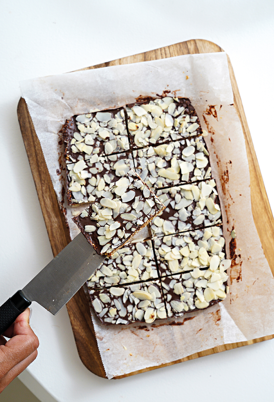 - Περιχύνουμε με το μείγμα της λιωμένης σοκολάτας τα υλικά στο ταψί. Πασπαλίζουμε την επιφάνεια με το φιλέ αμυγδάλου και μεταφέρουμε το παστέλι στο ψυγείο για τουλάχιστον μία ώρα, να σταθεροποιηθεί και να σφίξει. Κόβουμε και απολαμβάνουμε.
