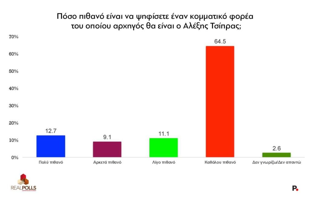 Ενα 12,7% απάντησε ότι είναι «πολύ πιθανό» να ψηφίσει έναν πολιτικό φορέα με επικεφαλής τον πρώην πρόεδρο του ΣΥΡΙΖΑ, ενώ ένα 9,1% απάντησε «αρκετά πιθανό». Ενα 64,5% απάντησε ότι δεν είναι καθόλου πιθανό να τον ψηφίσει.