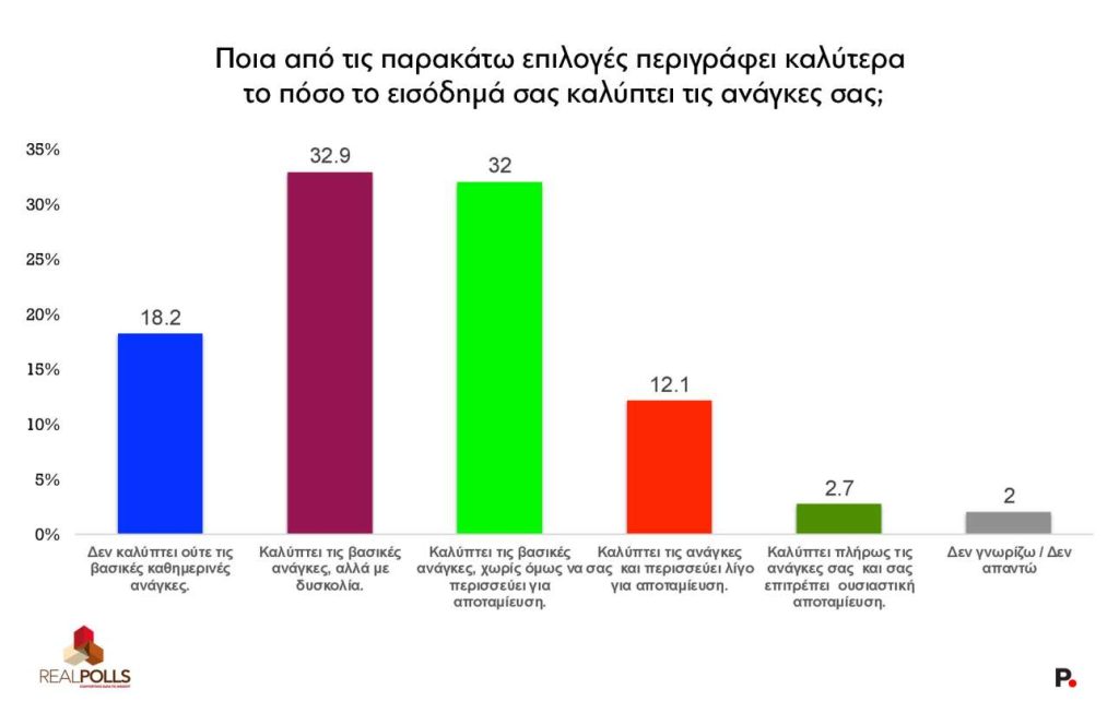 Η οικονομική κατάσταση και η καθημερινότητα φαίνεται πως είναι το μεγάλο ζητούμενο για το επόμενο διάστημα. Χαρακτηριστικό του προβλήματος είναι ότι στη μέτρηση βρέθηκε ένα 18,2% των πολιτών που δηλώνει ότι το εισόδημά τους δεν καλύπτει ούτε τις βασικές καθημερινές του ανάγκες και ένας στους δύο Ελληνες δηλώνει πως με δυσκολία καλύπτει τις βασικές του ανάγκες (Πίνακας VII).