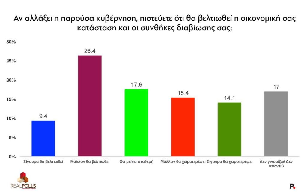 Παρόλα αυτά στην ερώτηση: «Αν αλλάξει η παρούσα κυβέρνηση, πιστεύετε ότι θα βελτιωθεί η οικονομική σας κατάσταση και οι συνθήκες διαβίωσης σας;» μόνο το 35,8% θεωρεί ότι σίγουρα ή/μάλλον θα βελτιωθεί, με το 47,1% να θεωρεί ότι η κατάσταση θα μείνει σταθερή ή και θα χειροτερέψει (Πίνακας VIII)