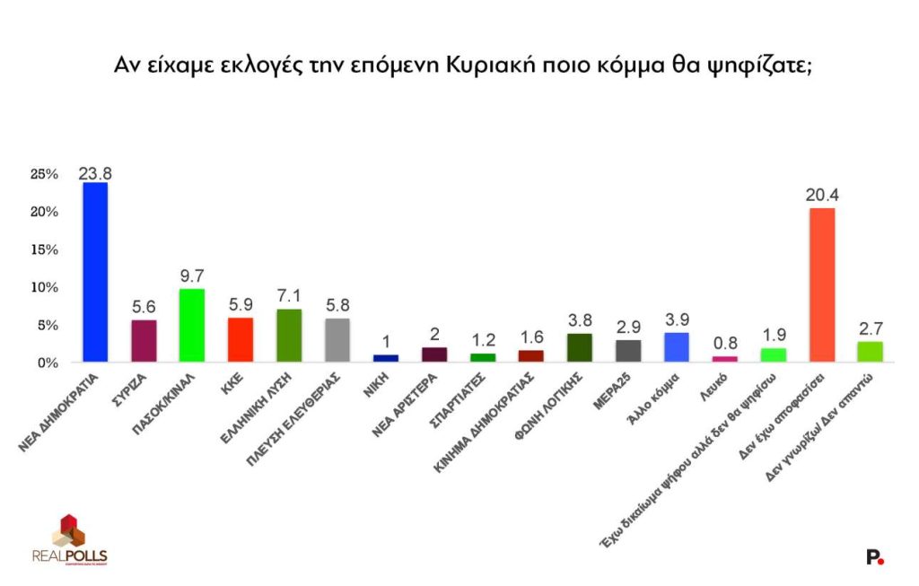 Στην πρόθεση ψήφου, η ΝΔ παραμένει πρώτη με 23,8%, ακολουθεί το ΠαΣοΚ με 9,7% και έπονται η Ελληνική Λύση με 7,1%, το ΚΚΕ (5,8%), η Πλεύση Ελευθερίας (5,7%) και ο ΣΥΡΙΖΑ (σε άνοδο 5,6%). Η Φωνή της Λογικής μετρήθηκε στο 3,8%, ενώ το ΜέΡΑ25 βρέθηκε στο όριο της κοινοβουλευτικής εκπροσώπησης, στο 2,9%.