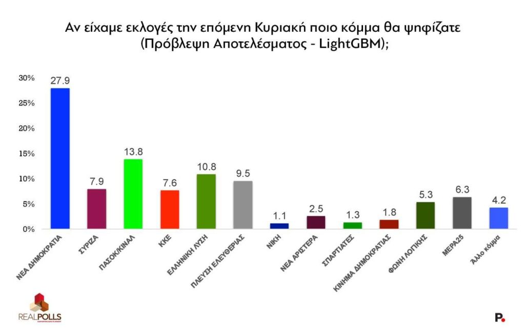 Στην πρόβλεψη εκλογικού αποτελέσματος, η ΝΔ βρέθηκε στο 27,9%, δηλαδή κάτω και από την επίδοσή της στις ευρωεκλογές. Το ΠαΣοΚ καταγράφηκε στο 13,8% και ακολουθούν η Ελληνική Λύση με 10,8% και η Πλεύση Ελευθερίας με 9,5%.