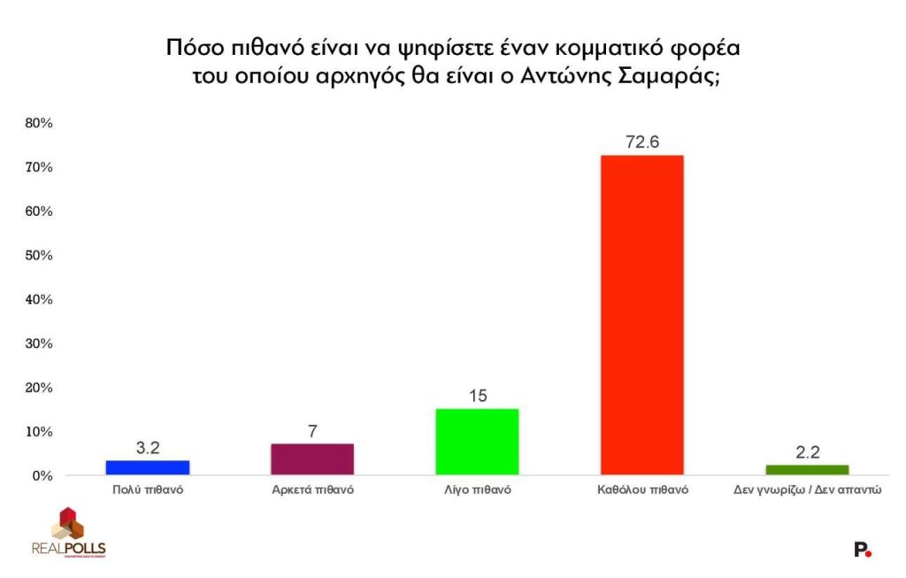 Πιο απογοητευτικά είναι τα ευρήματα της έρευνας για τον Αντώνη Σαμαρά (Πίνακας IV). Στη σχετική ερώτηση, μόλις το 3,2% δήλωσε ότι είναι «πολύ πιθανό» να ψηφίσει ένα κόμμα υπό τον κ. Σαμαρά και άλλο ένα 7% ότι είναι «αρκετά πιθανό». Το 72,6% των ερωτηθέντων απάντησαν ότι δεν είναι καθόλου πιθανό να τον ψηφίσουν.
