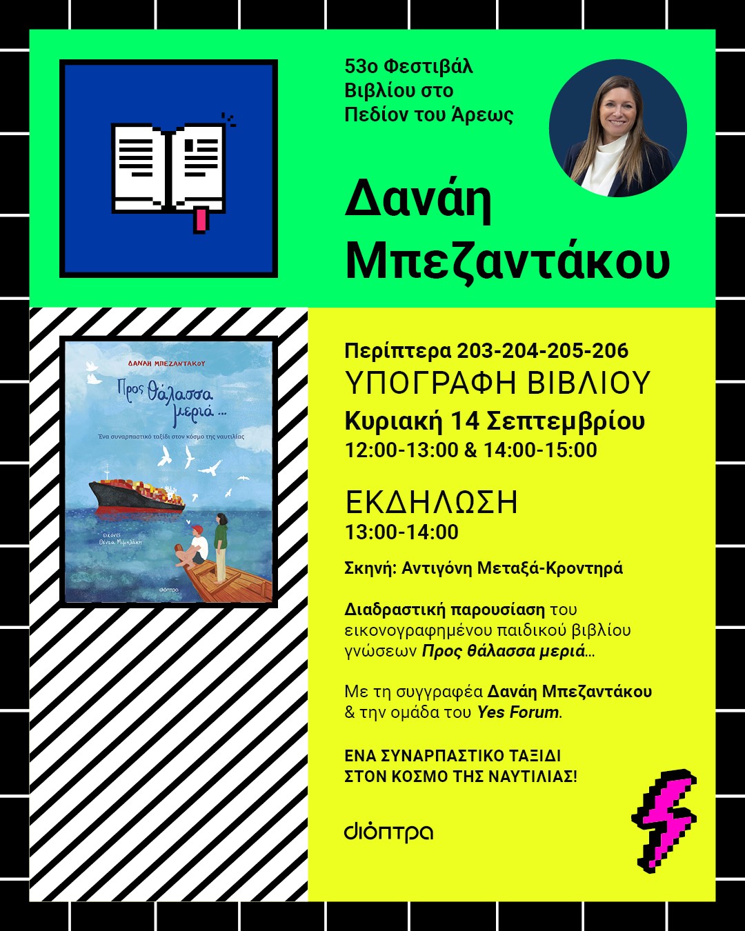 Μια ξεχωριστή εκδήλωση για μικρούς και μεγάλους θα φιλοξενήσει το 53ο Φεστιβάλ Βιβλίου στο Πεδίον του Άρεως. Την Κυριακή 14 Σεπτεμβρίου (13:00–14:00), στη σκηνή «Αντιγόνη Μεταξά – Κροντηρά», η Δανάη Μπεζαντάκου παρουσιάζει το παιδικό βιβλίο γνώσεων «Προς θάλασσα μεριά…», προσκαλώντας τους μικρούς αναγνώστες σε ένα ταξίδι στον μαγικό κόσμο της ναυτιλίας.