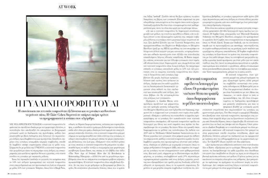 Το ταξίδι της αναζήτησης όμως δεν περιορίζεται στη μόδα. Στις σελίδες του νέου τεύχους, η ματιά στρέφεται και προς το μέλλον της τεχνολογίας, με την τεχνητή νοημοσύνη να τίθεται στο μικροσκόπιο. Μέσα από στοιχεία και μελέτες, καταγράφονται οι έμφυλες ανισότητες που αναπαράγει, εγείροντας το κρίσιμο ερώτημα: μπορεί η Τ.Ν. να εξελιχθεί σε ένα εργαλείο που σέβεται ουσιαστικά την ισότητα των φύλων;