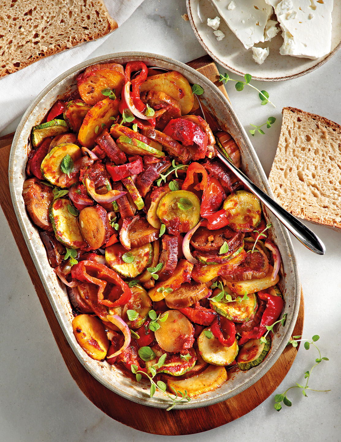 Αυτό το πιάτο ξεπήδησε από τις πρακτικές ανάγκες της αγροτικής ζωής. Εκεί όπου τα περιβόλια καθόριζαν το μενού της εβδομάδας και το μαγείρεμα δεν γινόταν με βιβλία αλλά με ό,τι περίσσευε στο καλάθι του κήπου. Ντομάτες ώριμες, μελιτζάνες, κολοκυθάκια, πατάτες νέας σοδειάς, κρεμμύδια, λίγο σκόρδο και ένα γενναιόδωρο ράντισμα με ελαιόλαδο – αυτά ήταν ανέκαθεν τα υλικά του. Ο φούρνος έκαιγε ήδη για το ψωμί της εβδομάδας, οπότε το ταψί με το φαγητό έμπαινε μαζί και αργοψηνόταν, έως ότου «παντρευτούν» τα λαχανικά.