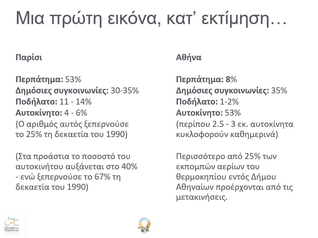 Κατά τη διάρκεια της παρουσίασης, ο κ. Παπαγεωργίου έφερε ως παράδειγμα το Παρίσι: μία πόλη με ιστορία, πολιτισμό, τουρισμό, με πολλά σημεία στους δρόμους που είναι ακόμη επικίνδυνα, υποδομές που δεν μοιάζουν με αυτές του Άμστερνταμ και της Κοπεγχάγης, αλλά ταιριάζουν περισσότερο στο… ελληνικό στυλ, και εξαιρετικά επιθετικούς οδηγούς αυτοκινήτων – πολύ περισσότερο από τους Έλληνες, όπως είπε χαρακτηριστικά. «Επιπλέον», σημείωσε, «είναι μια χώρα που παράγει αυτοκίνητα και το λόμπι των αυτοκινήτων είναι ιδιαίτερα ισχυρό».