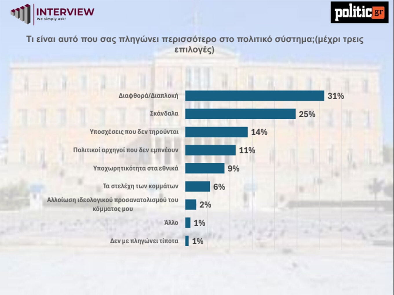 Εκείνο που πληγώνει περισσότερο την εικόνα του πολιτικού συστήματος είναι η διαφθορά / διαπλοκή με 31% και ακολουθούν τα σκάνδαλα με 25% και 14% οι υποσχέσεις που δεν τηρούνται.