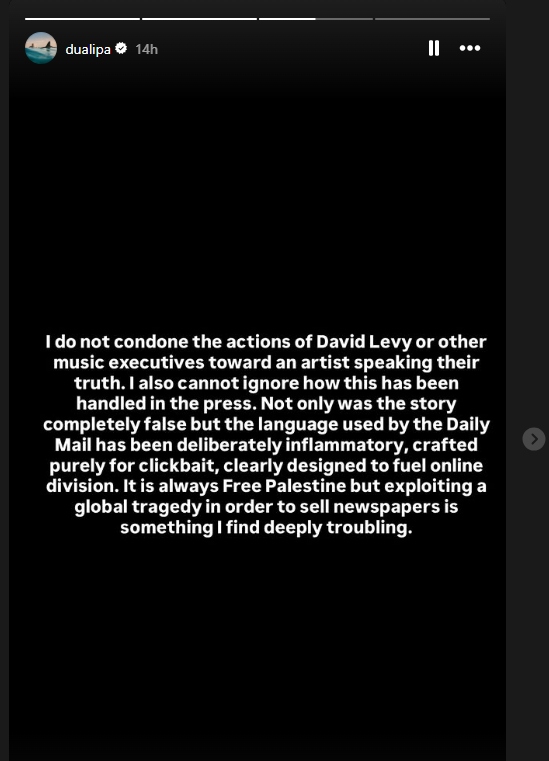 Το θέμα της Daily Mail αναπαράχθηκε από τα περισσότερα media ανά τον κόσμο. Το αρχικό ρεπορτάζ ήθελε την Dua Lipa να διακόπτει τη συνεργασία της με τον μάνατζέρ της David Levy. Λόγος των χωριστών δρόμων η υπογραφή του σε επιστολή για να κοπεί η εμφάνιση της φιλοπαλαιστινιακής μπάντας Kneecap από το Glastonbury.