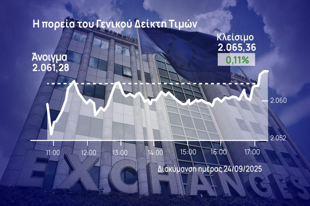 Ειδικότερα, ο Γενικός Δείκτης έκλεισε με κέρδη 0,11% στις 2.065,36 μονάδες, ενώ σήμερα κινήθηκε μεταξύ 2.052,06 μονάδων (-0,53%) και 2.065,36 μονάδων (+0,11%). Ο τζίρος ανήλθε στα 227,7 εκατ. ευρώ και ο όγκος στα 43,6 εκατ. τεμάχια, ενώ μέσω προσυμφωνημένων πράξεων διακινήθηκαν 15,3 εκατ. τεμάχια αξίας 61,2 εκατ. ευρώ (τα 50,3 εκατ. εξ αυτών στην Alpha Bank).