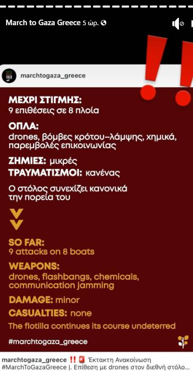 Υλοποιεί τις απειλές του το Ισραήλ ότι δε θα επιτρέψει στον στολίσκο με την ανθρωπιστική βοήθεια για την ισοπεδωμένη Γάζα να φτάσει στον προορισμό της, όπως φαίνεται από τις επιθέσεις με drones, κρότου–λάμψης, χημικά και παρεμβολές, πάνω από 12 στον αριθμό, που δέχθηκαν περίπου στις δύο τα ξημερώματα τα οκτώ πλοία του Global Sumud Flotilla, εντός της ελληνικής θαλάσσιας ζώνης έρευνας και διάσωσης.