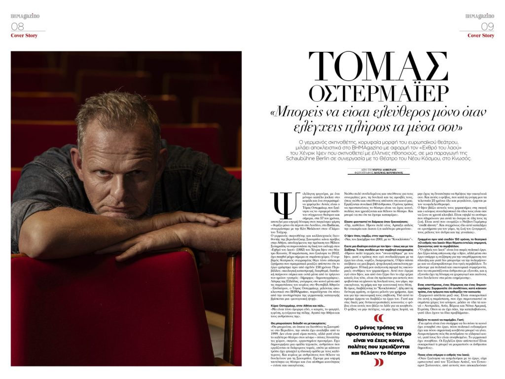Στο εξώφυλλο, ένας από τους κορυφαίους σκηνοθέτες του παγκόσμιου θεάτρου, ο Γερμανός Τόμας Οστερμάιερ, ο οποίος βρέθηκε στην Αθήνα για να ανεβάσει τον «Εχθρό του λαού» του Ίψεν. Στην πρώτη του αποκλειστική συνέντευξη στο ελληνικό κοινό, μιλά για την Ελλάδα με ενθουσιασμό, αποκαλύπτει τη φιλοσοφία του γύρω από την αλήθεια και την άγνοια, και θυμάται τη συνεργασία του με την Κέιτ Μπλάνσετ στον «Γλάρο» του Τσέχοφ.