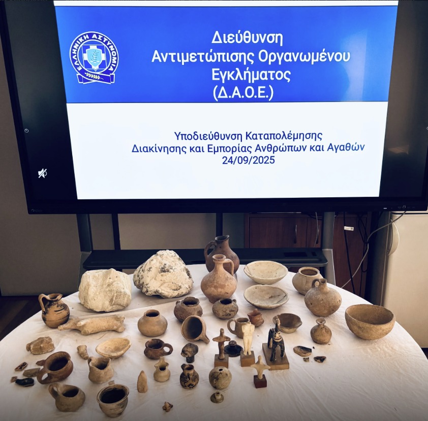 Από την Υποδιεύθυνση Καταπολέμησης Διακίνησης και Εμπορίας Ανθρώπων και Αγαθών της Διεύθυνσης Αντιμετώπισης Οργανωμένου Εγκλήματος, συνελήφθη 77χρονος ημεδαπός, κατηγορούμενος για παραβάσεις της νομοθεσίας για την προστασία των αρχαιοτήτων και εν γένει της πολιτιστικής κληρονομιάς, καθώς και απείθεια και υπεξαίρεση.