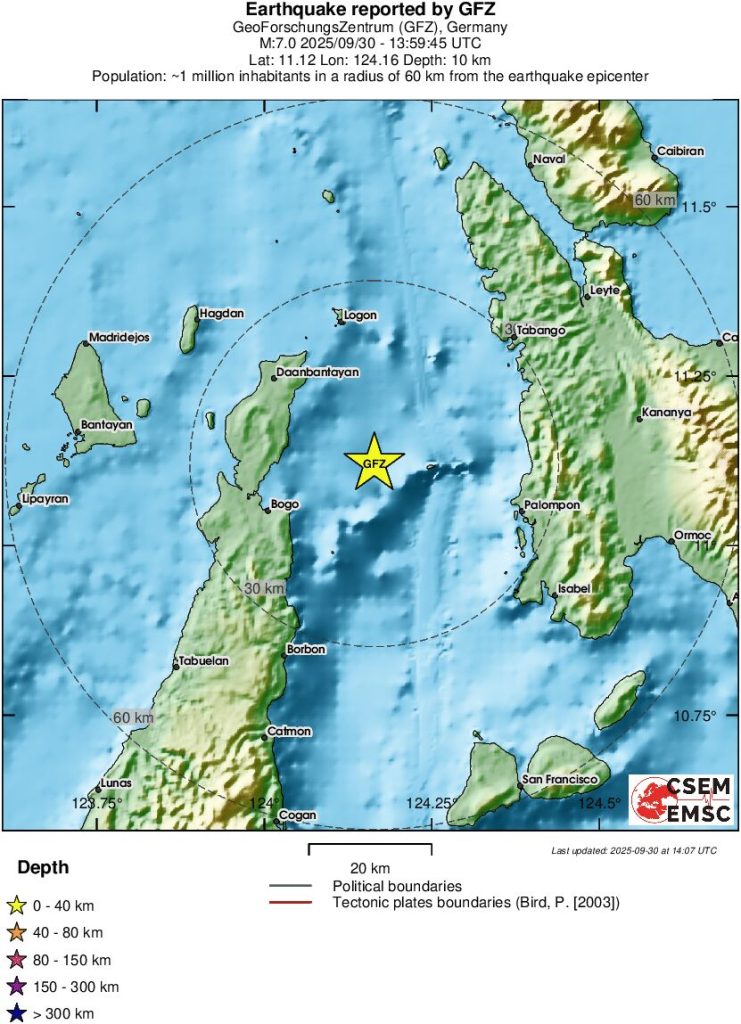 Σύμφωνα με το Φιλιππινέζικο Ινστιτούτο Ηφαιστειολογίας και Σεισμολογίας (PHIVOLCS), έπληξε την πόλης Μπόγκο, στο Σεμπού. Το επίκεντρο του σεισμού βρισκόταν 17 χιλιόμετρα βόρεια της πόλης. Ο σεισμός ήταν τεκτονικής προέλευσης και είχε βάθος 10 χιλιόμετρα.
