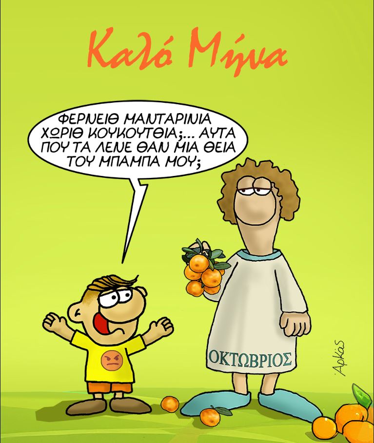 Στο σκίτσο του, σήμερα Ιη Οκτωβρίου 2025, σε φθινοπωρινούς χρωματικούς τόνους, απεικονίζει τον αγαπημένο του ήρωα από τους συμμαθητές, Θανασάκη, και τον ίδιο τον μήνα Οκτώβριο ο οποίος κρατά στα χέρια του φρούτα της εποχής.