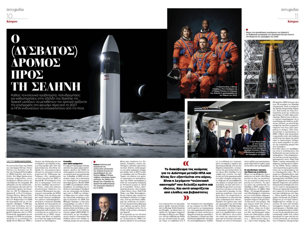 Το BHMAgazino παρακολουθεί επίσης τις εξελίξεις στη μεγάλη κούρσα του διαστήματος. Καθώς τεχνολογικές δυσκολίες και καθυστερήσεις στο πρόγραμμα Starship της SpaceX μοιάζουν να μεταθέτουν την επιστροφή του ανθρώπου στη Σελήνη μετά το 2027, οι Ηνωμένες Πολιτείες κινδυνεύουν να βρεθούν πίσω από την Κίνα σε έναν αγώνα που ξεπερνά τα όρια της επιστήμης και της φαντασίας.