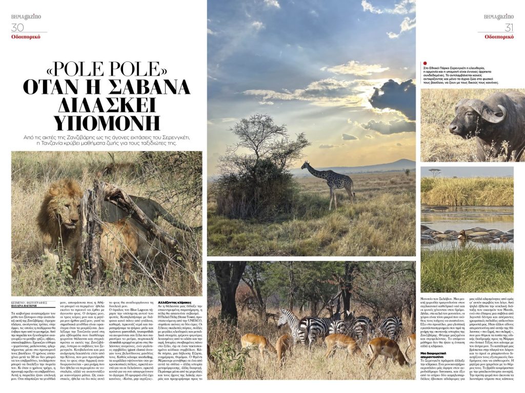 Και βεβαίως, το μεγάλο ταξιδιωτικό αφιέρωμα οδηγεί τους αναγνώστες στην Τανζανία. Από τις εξωτικές ακτές της Ζανζιβάρης μέχρι τις άγριες, άγονες εκτάσεις του Σερενγκέτι, η χώρα αποκαλύπτει μαθήματα ζωής, σε μια διαδρομή όπου η φύση, η ιστορία και η ανθρώπινη εμπειρία συναντιούνται με τρόπο συγκλονιστικό.