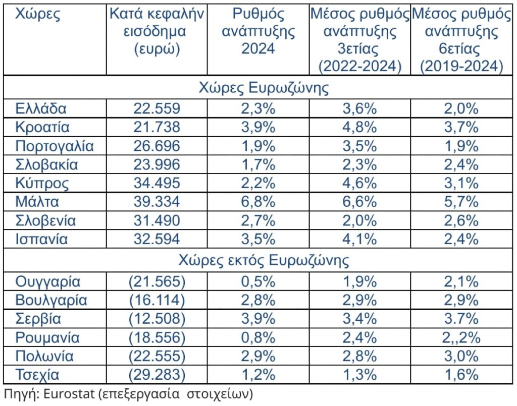 Ενώ, λοιπόν, η συνολική εικόνα είναι ότι την τελευταία εικοσαετία, πράγματι όπως προβλέπει η, επιβεβαιωμένη από τα επιτεύγματα των ασιατικών χωρών οικονομική θεωρία, (convergence theory ή catch-up theory), η ομάδα των φτωχών χωρών της ευρωζώνης και της ΕΕ διαχρονικά τείνει να συγκλίνει προς το επίπεδο εισοδήματος των πλουσίων χωρών, έστω και αν ακόμη απέχει αρκετά από αυτές, εντός της συγκεκριμένης ομάδας χωρών, η Ελλάδα δεν παρακολουθεί την κοινή πορεία, “βραδυπορώντας” και αποκλίνοντας προς χαμηλότερα συγκριτικά επίπεδα, χάνοντας την θέση που είχε στην αρχή της περιόδου δηλαδή το 2005, στην μεγάλη διεύρυνση της ΕΕ. Και, όπως δείχνει ο πιό κάτω πίνακας, αυτό δεν αλλάζει ουσιαστικά την τελευταία υποπερίοδο. Όπως φαίνεται, σε μέσο όρο εξαετίας, από το 2019 έως το 2024, η Ελλάδα πάλι υπολείπεται του αναπτυξιακού ρυθμού σχεδόν όλων των χωρων της “φτωχής Ευρώπης”, υπερέχουσα μόνο, εντελώς οριακά, της Τσεχίας και της Πορτογαλίας, (οι οποίες, βεβαίως, την περασμένη δεκαετία την ξεπέρασαν σε κατά κεφαλήν εισόδημα).