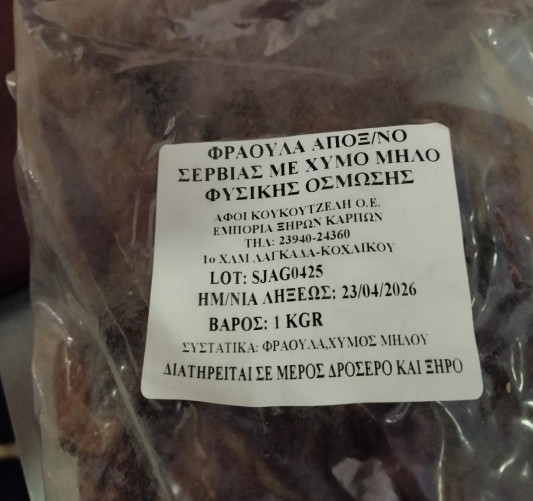 Πρόκειται για προϊόν προέλευσης Σερβίας σε πλαστική κλειστή συσκευασία 1Kg, με αριθμό παρτίδας SJAG0425 και ανάλωση κατά προτίμηση πριν από: 23/04/2026 που διατίθεται από την επιχείρηση «ΑΦΟΙ ΚΟΥΚΟΥΤΖΕΛΗ ΟΕ» με έδρα στον 1ο χλμ Λαγκαδά-Κολχικού.
