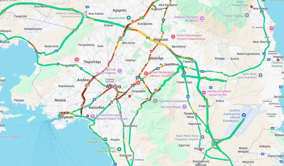Την ίδια ώρα πολλά προβλήματα υπάρχουν στην Κηφισιάς, την Μεσογείων και σε όλους τους δρόμους στο κέντρο της Αθήνας.