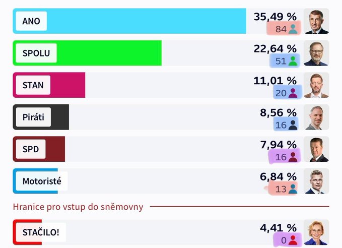 Η συμμετοχή άγγιξε το 68%, το υψηλότερο από το 1998. Η παράταξη STAN ακολουθεί με 10%, ενώ το ακροδεξιό, ευρωσκεπτικιστικό SPD βρίσκεται στο 8%. Έκπληξη των εκλογών αποτελεί το νέο κόμμα Motorists for Themselves, που μπαίνει στη Βουλή με 7%. Αντιθέτως, το ακροαριστερό Stačilo! πιθανότατα δεν περνά το όριο.