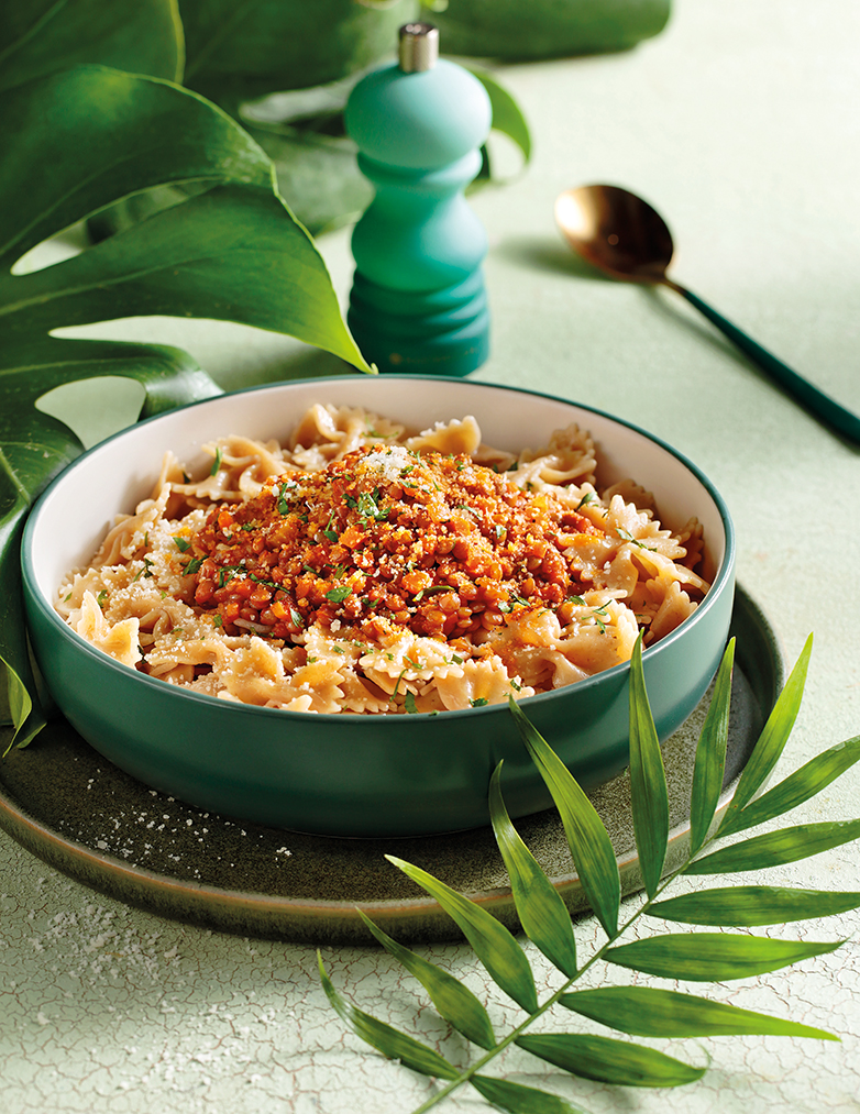 - Σερβίρουμε τα ζυμαρικά ολικής άλεσης με τον κιμά φακής, πασπαλίζοντας στα πιάτα με φυτική παρμεζάνα και φρεσκοτριμμένο πιπέρι.