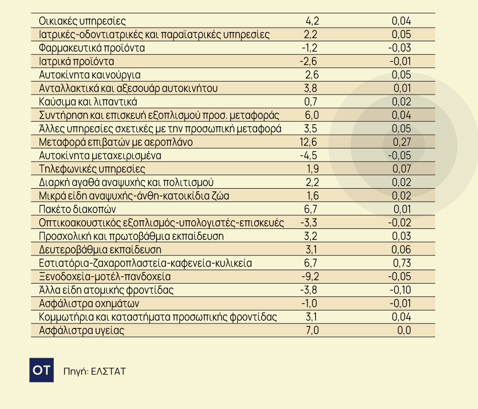 - 5,9% στην ομάδα Ξενοδοχεία-Καφέ-Εστιατόρια, λόγω αύξησης κυρίως των τιμών στα εστιατόρια-ζαχαροπλαστεία-καφενείακυλικεία. Μέρος της αύξησης αυτής αντισταθμίστηκε από τη μείωση κυρίως των τιμών σε ξενοδοχεία-μοτέλ-πανδοχεία.