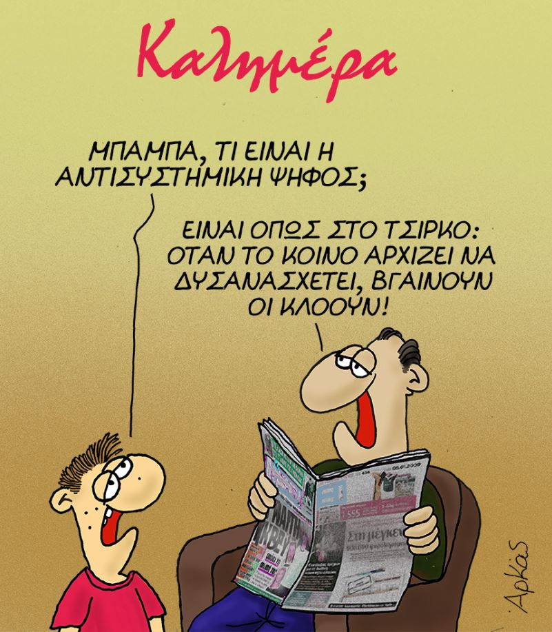 Ο διάλογος που ακολουθεί μεταξύ πατέρα και γιου δίνει την εικόνα που έχει ο Αρκάς για την πολιτική επικαιρότητα και το πολιτικό γίγνεσθαι.