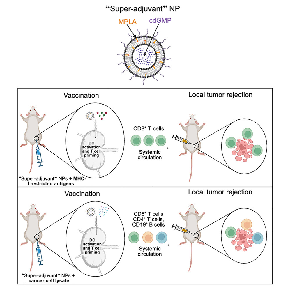 Ωστόσο, όπως συμβαίνει με το λάδι και το νερό, πολλά από τα πιο υποσχόμενα ανοσοενισχυτικά που χρησιμοποιούνται στην ανοσοθεραπεία του καρκίνου δεν αναμειγνύονται σωστά σε μοριακό επίπεδο. Για να υπερπηδήσουν αυτό το εμπόδιο, οι ερευνητές του Εργαστηρίου Ατουκοράλε ανέπτυξαν ένα «υπερ-ανοσοενισχυτικό» με βάση νανοσωματίδια λιπιδίων. Αυτό το σούπερ-ενισχυτικό μεταφέρει με ασφάλεια δύο διαφορετικά ανοσοενισχυτικά τα οποία επάγουν ανοσία με έναν συντονισμένο τρόπο.