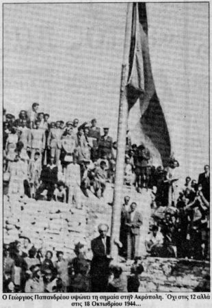 »Κατά τις 9, από την Ομόνοια πάλι, είδαμε στο ξέμακρο της οδού Αθηνάς, σε προοπτική – τότε δεν υπήρχε νέφος κι όλα ήταν διαυγή – να υποστέλεται στην Ακρόπολη η “Σβάστικα”, η μισητή γερμανική σημαία. Αυτό ήταν! Που βρέθηκε τόσος κόσμος και γέμισε τους δρόμους; Για πότε σχηματίστηκαν διαδηλώσεις; Πώς ξεφύτρωσε – μάλλον από το Εργατικό Κέντρο της οδού Αγησιλάου – ολόκληρη φανφάρα Τροχιοδρομικών […] κι έκανε παρέλαση συνταγμένη;