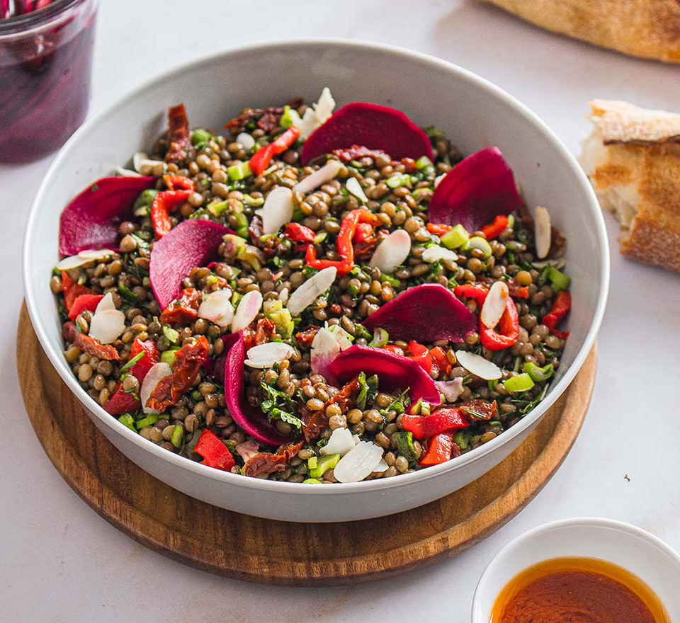 Πίκλα παντζαριού με φακές και dressing λιαστής ντομάτας