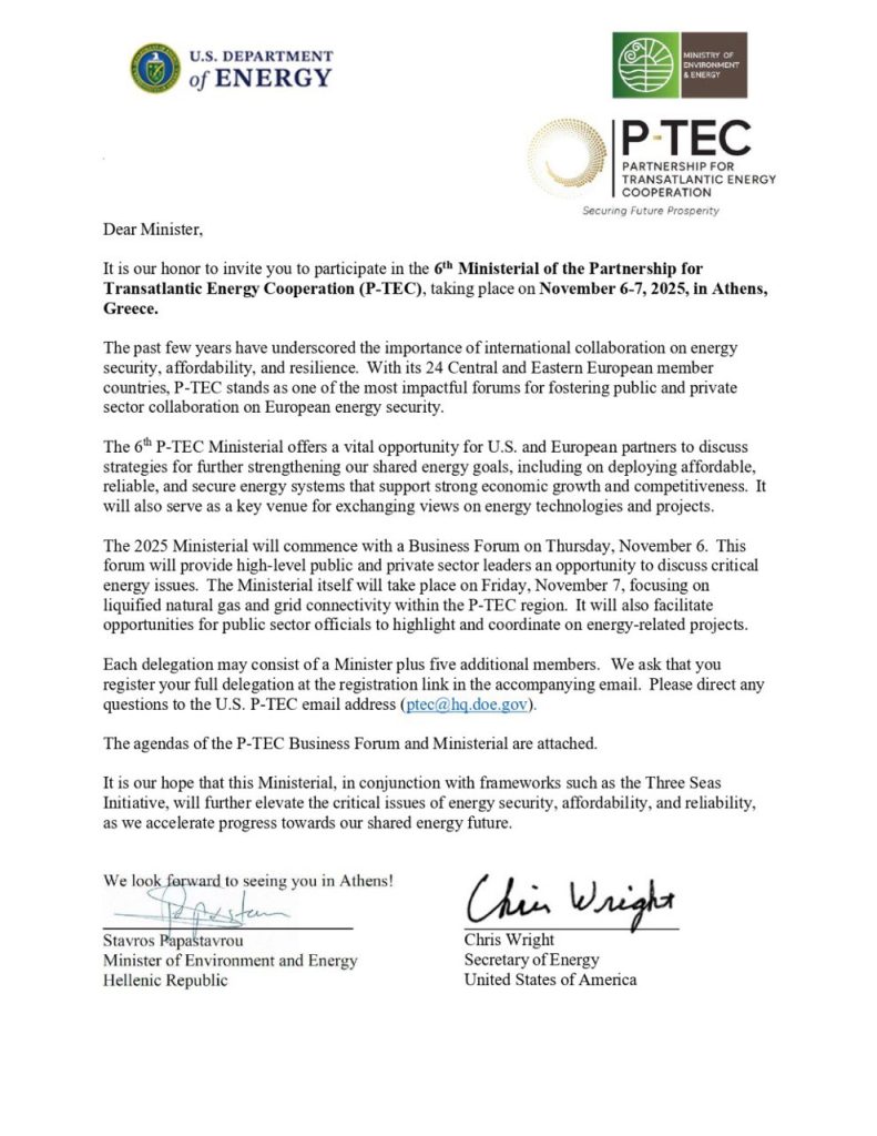 «Η 6η Υπουργική Διάσκεψη P-TEC προσφέρει την ευκαιρία στους εταίρους των ΗΠΑ και της Ευρώπης να συζητήσουν στρατηγικές για την περαιτέρω ενίσχυση των κοινών μας ενεργειακών στόχων, συμπεριλαμβανομένης της ανάπτυξης οικονομικά προσιτών, αξιόπιστων και ασφαλών ενεργειακών συστημάτων που υποστηρίζουν ισχυρή οικονομική ανάπτυξη και ανταγωνιστικότητα. Θα λειτουργήσει επίσης ως βασική πλατφόρμα ανταλλαγής απόψεων για ενεργειακές τεχνολογίες και έργα».