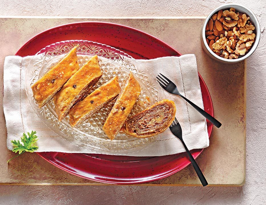- Καλύπτουμε με το δεύτερο φύλλο, το αλείφουμε με ελαιόλαδο και το πασπαλίζουμε με 1/4 από τη γέμιση. Τυλίγουμε σε ρολό αλείφοντας με ελαιόλαδο το φύλλο και το μεταφέρουμε σε λαδωμένο ταψί. Ομοίως φτιάχνουμε και το δεύτερο ρολό.