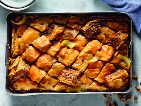 - Προθερμαίνουμε το φούρνο στους 150°C. Με ένα κοφτερό μαχαίρι χαράζουμε τον μπακλαβά διαγώνια σε κομμάτια δημιουργώντας ρόμβους και φτάνοντας το μαχαίρι σχεδόν μέχρι τον πάτο του ταψιού.