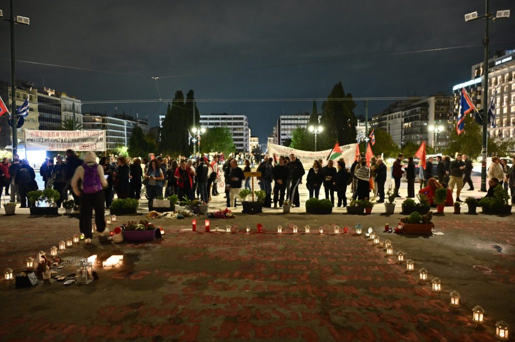 Πλήθος κόσμου συγκεντρώθηκε στο Σύνταγμα, μπροστά από τη Βουλή, το απόγευμα της Κυριακής 19/10 για τη συγκέντρωση διαμαρτυρίας στο «Μνημείο ονομάτων θυμάτων των Τεμπών», κατά της τροπολογίας για το μνημείο του Αγνώστου Στρατιώτη.