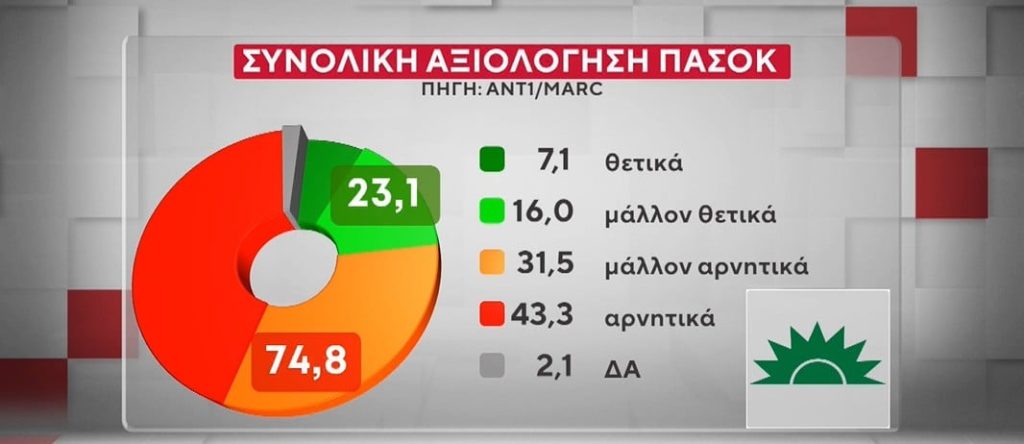 Ως προς την αξιολόγηση της αξιωματικής αντιπολίτευσης το 23,1% την αξιολογεί θετικά και το 74,8% αρνητικά.