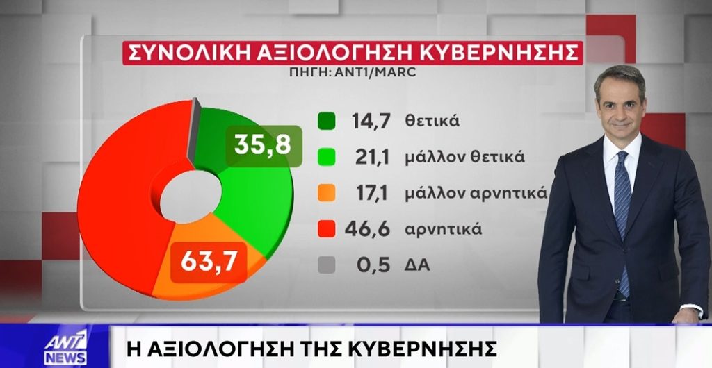 Ως προς την αξιολόγηση της κυβέρνησης το 35,8% την αξιολογεί θετικά και το 63,7% αρνητικά.