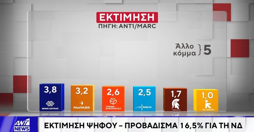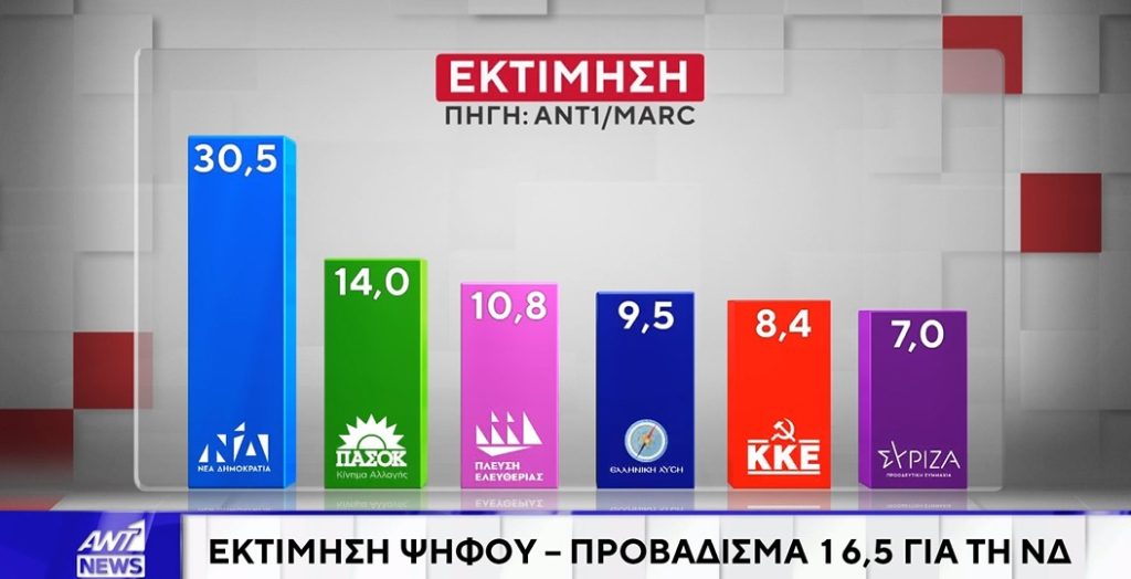Στην εκτίμηση ψήφου, η ΝΔ είναι στο 30,5%, το ΠΑΣΟΚ 14%, η Πλεύση Ελευθερίας 10,8%, η Ελληνική Λύση 9,5%, το ΚΚΕ 8,4%, ο ΣΥΡΙΖΑ 7%, η Φωνή Λογικής 3,8%, το ΜέΡΑ25 3,2%, το Κίνημα Δημοκρατίας 2,6%, η Νίκη 2,5%, οι Σπαρτιάτες 1,7%, η Νέα Αριστερά 1%.