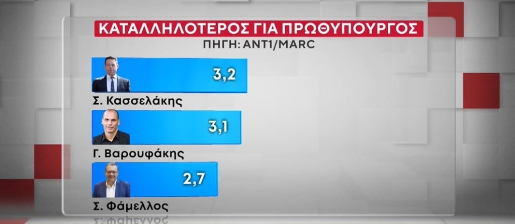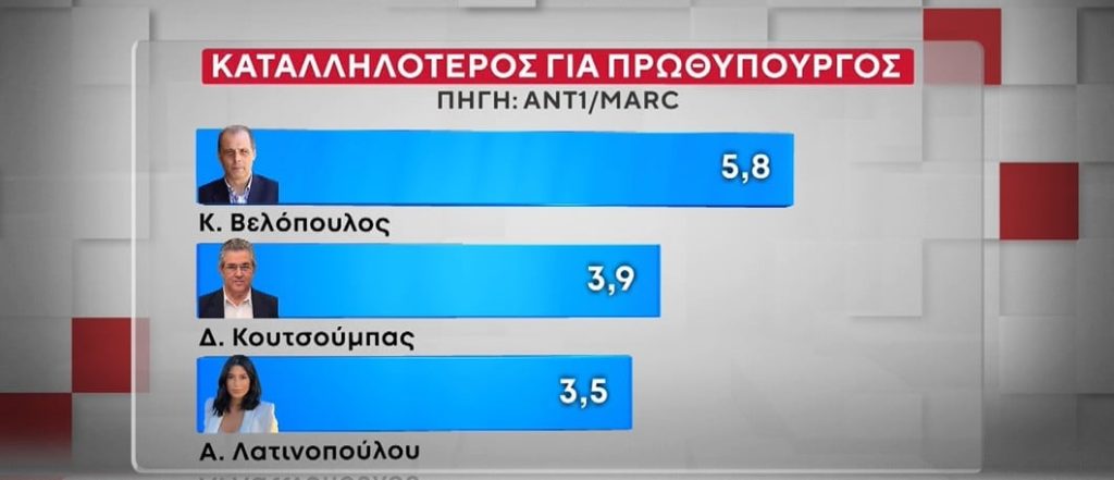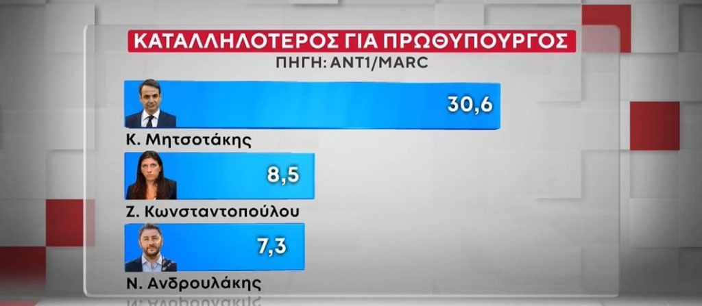 Καταλληλότερος για την Πρωθυπουργία εμφανίζεται, σύμφωνα με τη δημοσκόπηση της Marc, ο Κυριάκος Μητσοτάκης με 30,6%, δεύτερη η Ζωή Κωνσταντοπούλου με 8,5%, ο Νίκος Ανδρουλάκης 7,3%, ο Κυριάκος Βελόπουλος 5,8%, ο Δημήτρης Κουτσύμπας 3,9%, η Αφροδίτη Λατινοπούλου 3,5%, ο Στέφανος Κασσελάκης 3,2%, ο Γιάνης Βαρουφάκης 3,1%, ο Σωκράτης Φάμελλος 2,7%, ο Βασίλης Στίγκας 0,6%, ο Δημήτρης Νατσιός 0, 5%, ο Αλέξης Χαρίτσης 0,1%.
