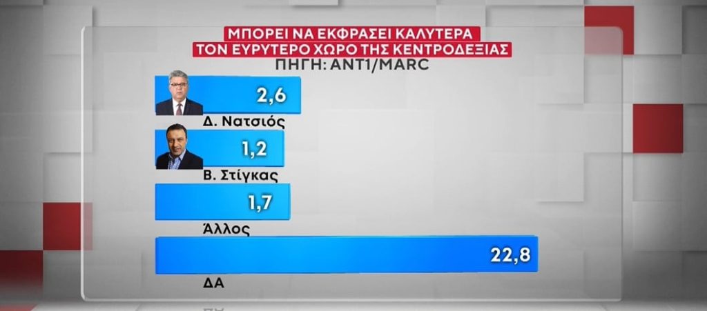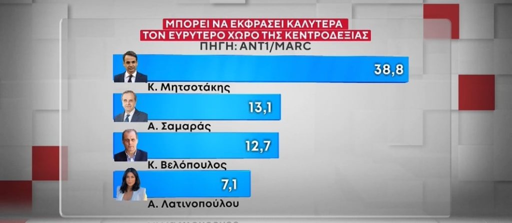 Σε ερώτηση ποιος μπορεί να εκφράσει καλύτερα τον χώρο της Κεντροδεξιάς, πρώτος έρχεται ο Κυριάκος Μητσοτάκης με 38,8%, ακολουθεί ο Αντώνης Σαμαράς με 13,1%, ο Κυριάκος Βελόπουλος 12,7%, η Αφροδίτη Λατινοπούλου 7,1%, ο Δημήτρης Νατσιός 2,6%, ο Βασίλης Στίγκας 1,2%, Άλλος 1,7%, ενώ ΔΑ απαντά το 22,8%.