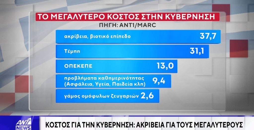 Τρία είναι τα «ανοιχτά μέτωπα» της κυβέρνησης και τα οποία καλείται να αντιμετωπίσει, σύμφωνα με τη γνώμη των πολιτών, όπως καταγράφηκαν στη δημοσκόπηση της Marc για τον ANT1. Ειδικότερα, η ακρίβεια, τα Τέμπη και το σκάνδαλο του ΟΠΕΚΕΠΕ είναι οι τρεις παράμετροι με το μεγαλύτερο κόστος για αυτή.