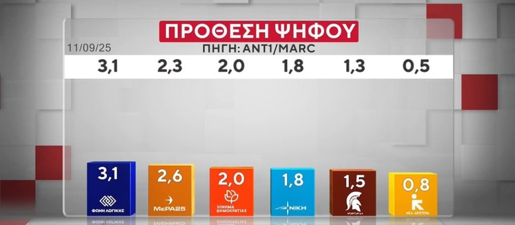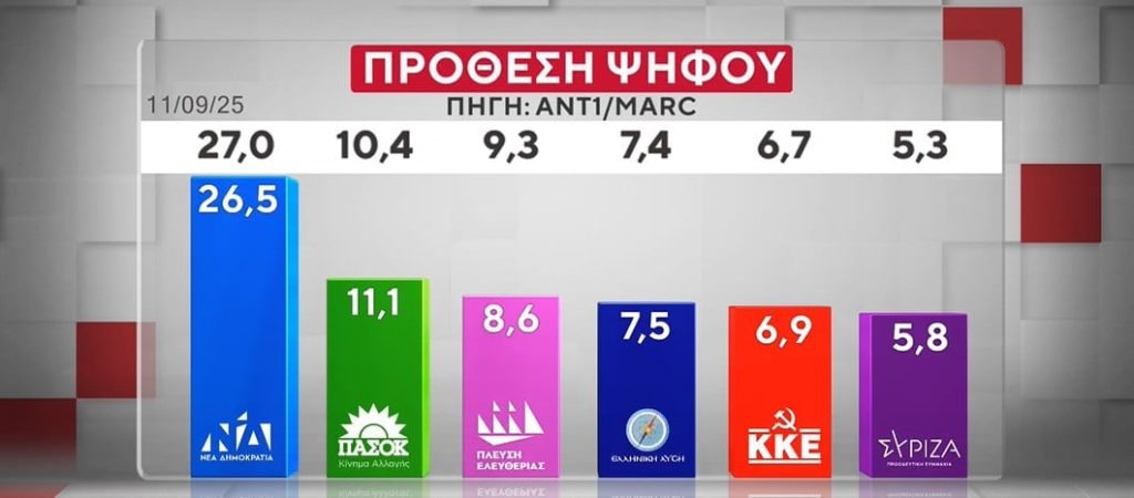 Σαφέστερα, σύμφωνα με την έρευνα της Marc, στην πρόθεση ψήφου η ΝΔ είναι στο 26,5%, το ΠΑΣΟΚ 11,1%, η Πλεύση Ελευθερίας 8,6%, η Ελληνική Λύση 7,5%, το ΚΚΕ 6,9%, ο ΣΥΡΙΖΑ 5,8%, η Φωνή Λογικής 3,1%, το ΜέΡΑ25 2,6%, το Κίνημα Δημοκρατίας 2%, η Νίκη 1,8%, οι Σπαρτιάτες 1,5%, η Νέα Αριστερά 0,8%.