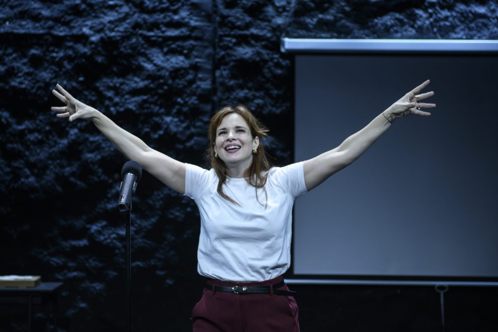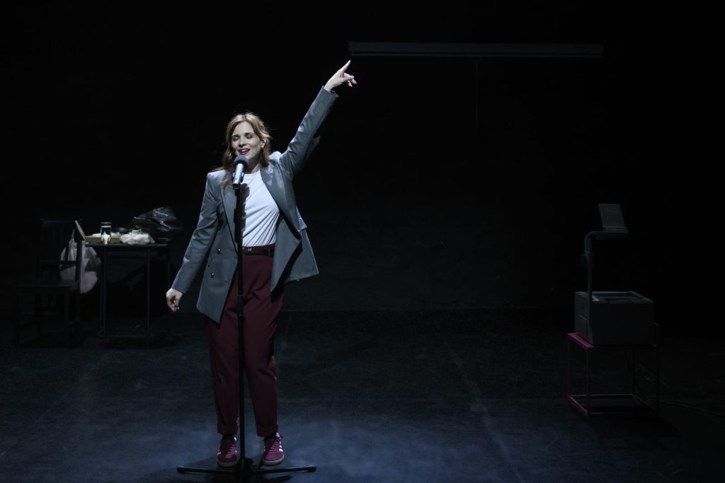 Η Ευγενία Δημητροπούλου στην παράσταση «Κοιμούνται τα ψάρια;» σε σκηνοθεσία Ζωής Ξανθοπούλου. Φωτ. Ελίνα Γιουνανλή