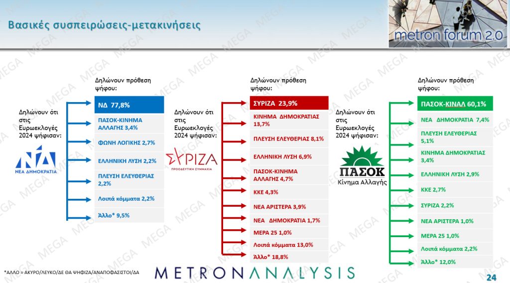 Επίσης, η Νέα Δημοκρατία παρουσιάζει μικρά ποσοστά διαρροής προς το κέντρο και συγκεκριμένα προς το ΠαΣοΚ, με μόλις το 3,4% εκείνων που ψήφισαν Νέα Δημοκρατία στις Ευρωεκλογές του 2024 να δηλώνουν ότι θα το ψηφίσουν. Αντίθετα, το κόμμα της κυβερνητικής πλειοψηφίας εμφανίζει μεγαλύτερες διαρροές προς τα δεξιά του.