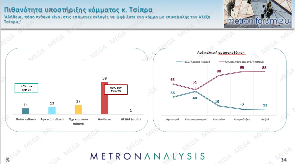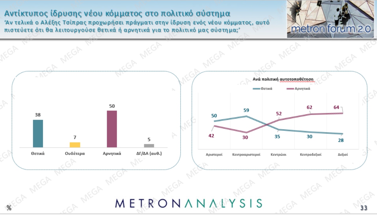 Με βάση τα στοιχεία της Metron, η πλειονότητα των Κεντροαριστερών της έρευνας και θεωρούν ότι θα επιδρούσε θετικά στο πολιτικό σκηνικό ένα κόμμα Τσίπρα (59%) και θα ήταν διατεθειμένοι να το ψηφίσουν (51%) στην εθνική κάλπη. Οι αντίστοιχες τιμές στους Αριστερούς είναι 50% και 42%. Αναπόφευκτο είναι, υπό αυτό το καθεστώς το status, ο ΣΥΡΙΖΑ να πιέζεται χάνοντας κι άλλες δυνάμεις στην πρόθεση ψήφου (από το 6.2% στο 4.9%).