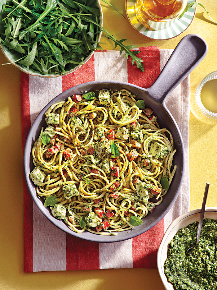 3. Αν μας φανεί πολύ σφιχτή η σάλτσα, την αραιώνουμε με λίγες σταγόνες νερό, ενώ αν θέλουμε περισσότερη νοστιμιά, προσθέτουμε ψιλοτριμμένη παρμεζάνα και ανακατεύουμε. Χρησιμοποιούμε 2 κ.σ. στη μακαρονάδα και διατηρούμε το υπόλοιπο πέστο σε βάζο στο ψυγείο.