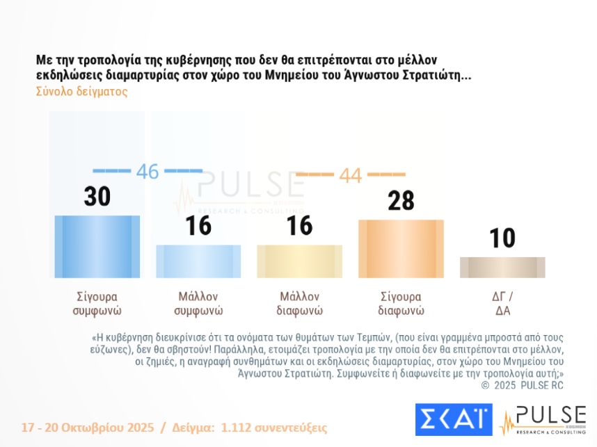 Μοιρασμένες είναι οι απόψεις των πολιτών σχετικά με την τροπολογία που ψηφίστηκε την Τετάρτη στη Βουλή για τον Άγνωστο Στρατιώτη, σύμφωνα με την δημοσκόπηση της εταιρείας Pulse για λογαριασμό του ΣΚΑΪ. Πιο συγκεκριμένα, το 46% συμφωνεί και μάλλον συμφωνεί με την απαγόρευση διαμαρτυριών στο μνημείο, ενώ το 44% διαφωνεί και μάλλον διαφωνεί.